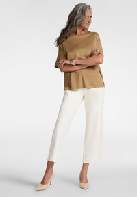 Donna matura con lunghi capelli grigi, indossa una maglietta a maniche corte color cammello con decorazioni e pantaloni bianchi, posando con una mano in tasca.