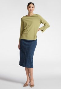 Top verde lime a maniche lunghe con scollo arrotondato, spacchi laterali sull'orlo e una texture morbida e liscia, abbinato a una gonna di jeans.