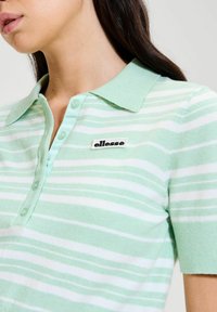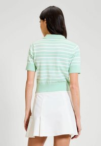 Donna che indossa una polo corta a righe verde menta e bianca e una gonna bianca plissettata, in piedi contro uno sfondo uniforme.