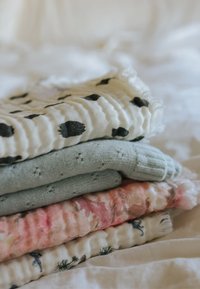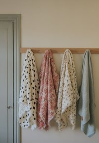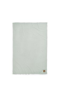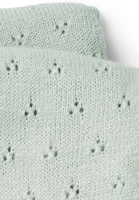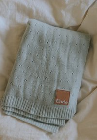 Coperta lavorata a maglia di colore verde chiaro piegata, con un piccolo motivo ad occhiello e un'etichetta in pelle marrone con la scritta "Elodie" su sfondo bianco.