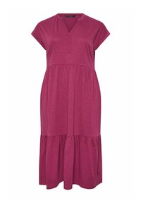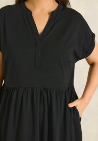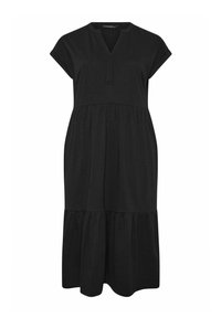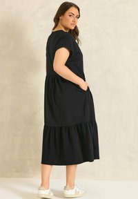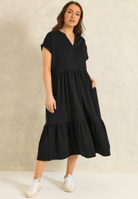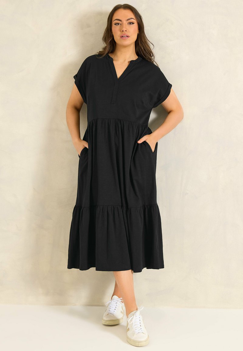 Donna in piedi con un vestito midi nero a balze, maniche corte e tasche, indossa sneakers bianche, su uno sfondo chiaro uniforme.