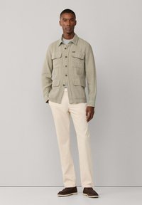 Uomo che indossa una giacca di lino verde chiaro con bottoni e quattro tasche con patta, maglietta grigia sottostante e pantaloni color crema su uno sfondo semplice.