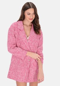 Blazer in tweed rosa con forma squadrata, modello doppiopetto, rever a incavo e maniche leggermente oversize, caratterizzato da un motivo testurizzato.
