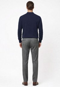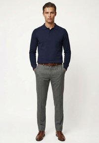 Uomo in piedi con le mani nelle tasche, indossa una polo a maniche lunghe blu navy, pantaloni grigi con cintura marrone e scarpe di pelle marroni su uno sfondo semplice.
