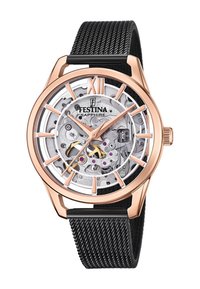 Orologio scheletrato con cassa in oro rosa e bracciale a rete. Presenta un quadrante trasparente che rivela i meccanismi interni, accenti argento e grandi indicatori delle ore.