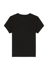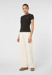 Giovane donna che indossa una maglietta attillata nera FILA e pantaloni color avorio, in piedi davanti a uno sfondo grigio chiaro uniforme.