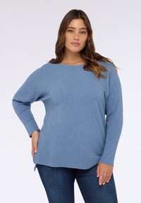 Maglione azzurro chiaro a coste con un'ampia scollatura e maniche lunghe, dotato di spacchi laterali all'orlo per facilitare i movimenti. Abbinato a jeans scuri.