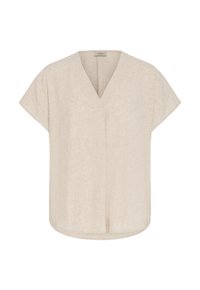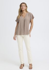 Donna con capelli biondi lunghi che indossa una maglietta beige a maniche corte con scollo a V e pantaloni bianco sporco, sorridente su uno sfondo chiaro uniforme.