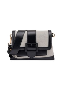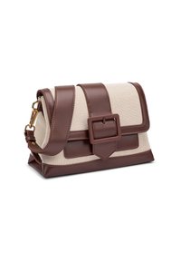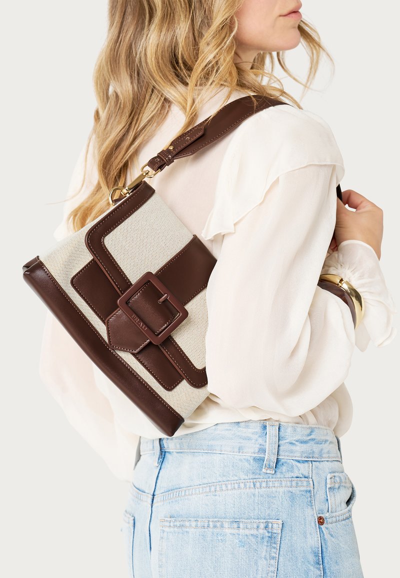 Donna con camicetta bianca e jeans chiari che porta una borsa a tracolla in pelle beige e marrone con grande fibbia e dettagli dorati.