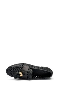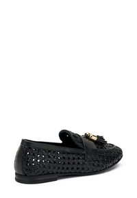 Mocassini neri intrecciati con superficie testurizzata, fascia in pelle e nappina decorativa. Dotati di suola in gomma a profilo basso.