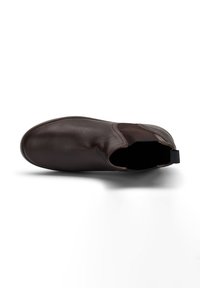 Stivali ankle in pelle marrone con pannelli laterali elasticizzati, un passante sul retro e suola in gomma. Texture liscia con dettagli di cucitura minimi.