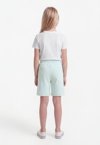 Ragazza sorridente con lunghi capelli biondi che indossa una maglietta bianca, pantaloncini verde menta con coulisse e scarpe da ginnastica bianche, in piedi davanti a uno sfondo bianco.