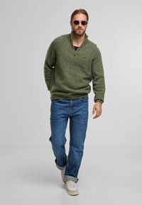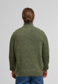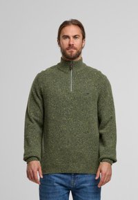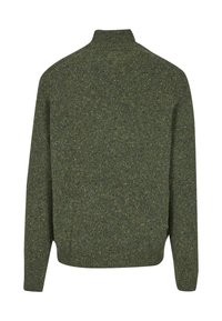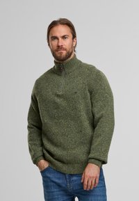 Maglione verde lavorato a maglia con colletto alto e chiusura a metà zip. Il materiale presenta un motivo testurizzato con piccole macchie di colore. Vestibilità casual.