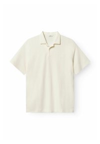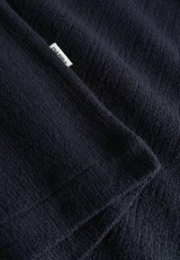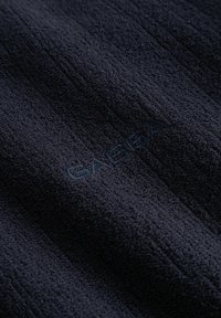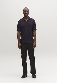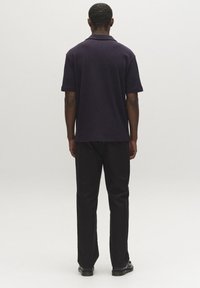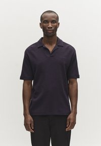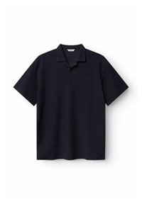 Uomo che indossa una polo a maniche corte blu navy scuro, in piedi dritto contro uno sfondo uniforme grigio chiaro.