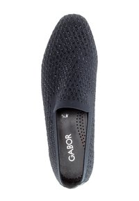 Scarpa slip-on blu navy con tomaia in maglia testurizzata che presenta piccoli fori decorativi, tessuto flessibile e suola in gomma nera dal profilo basso.