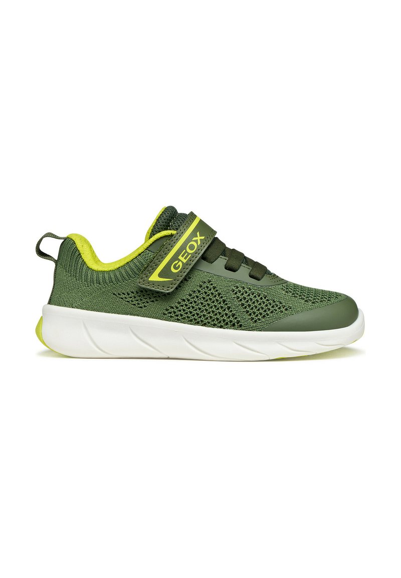 Scarpa da ginnastica per bambini verde e gialla con parte superiore in maglia, cinturino in Velcro, lacci elastici, suola bianca e tirante sul tallone, vista laterale.