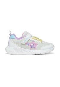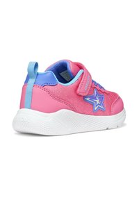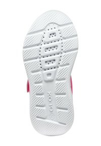 Scarpetta da bambino rosa e blu con suola bianca, toppa a stella sul lato, lacci blu e cinturino in Velcro rosa con la scritta "GEOX".