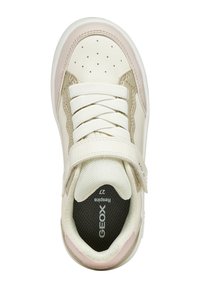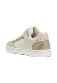 Sneaker bianca e beige con accenti rosa e oro, dotata di cinturino in velcro, tomaia testurizzata e suola ammortizzata. Logo Geox visibile.