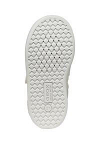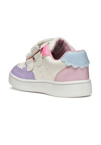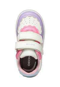 Scarpa da ginnastica per bambini con base bianca, accenti rosa, viola e azzurro, due cinturini in velcro bianchi e dettagli perforati sul lato.