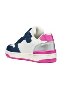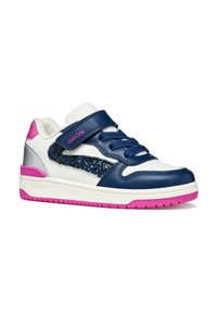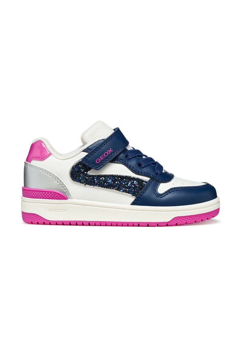 Sneaker bianca e blu navy con accenti rosa, pannello laterale glitterato e testurizzato, materiali in pelle e sintetici, cinturino in Velcro e suola in gomma.
