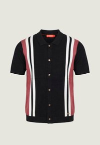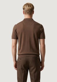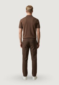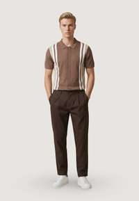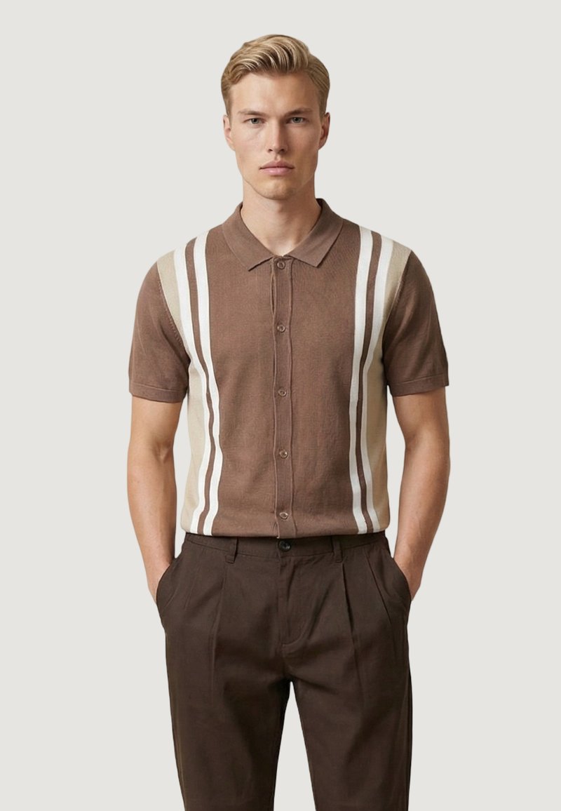 Giovane uomo che indossa una camicia marrone a maniche corte con bottoni e righe verticali bianche, e pantaloni marrone scuro, in piedi con le mani nelle tasche.