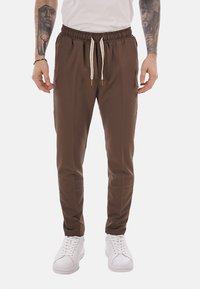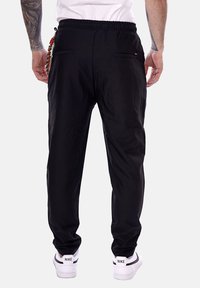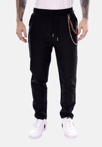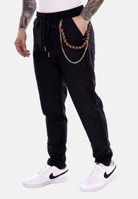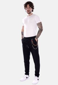 Uomo che indossa pantaloni jogger neri con un accessorio a catena intrecciata, sneaker bianche e una maglietta bianca, in piedi davanti a uno sfondo semplice.