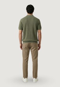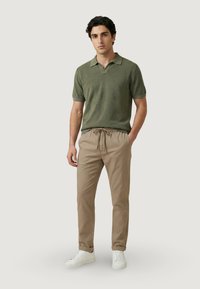 Uomo con capelli scuri che indossa una polo verde oliva a maniche corte e pantaloni beige con coulisse, in piedi contro uno sfondo chiaro e semplice.