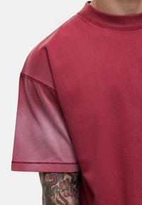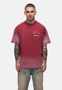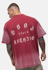 T-shirt oversize rosso e rosa sbiadito con grande testo bianco sul retro. Maniche corte, vestibilità rilassata e effetto tintura del capo all'orlo.