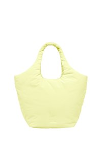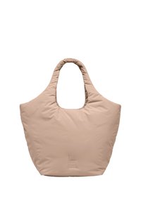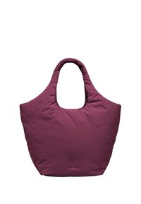 Borsa a spalla viola imbottita con apertura ampia, texture liscia e tracolla regolabile, tenuta da una persona in una maglietta bianca e pantaloni grigi.
