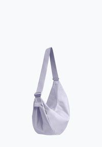 Giovane donna con capelli afro, indossa un dolcevita bianco e jeans, porta una grande borsa a tracolla viola chiaro attraversata sul petto.