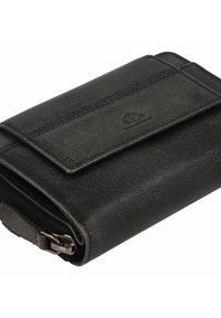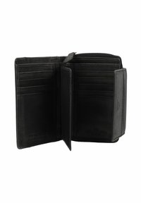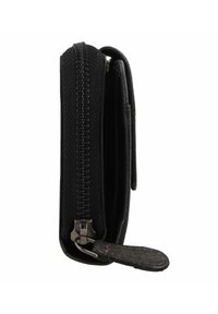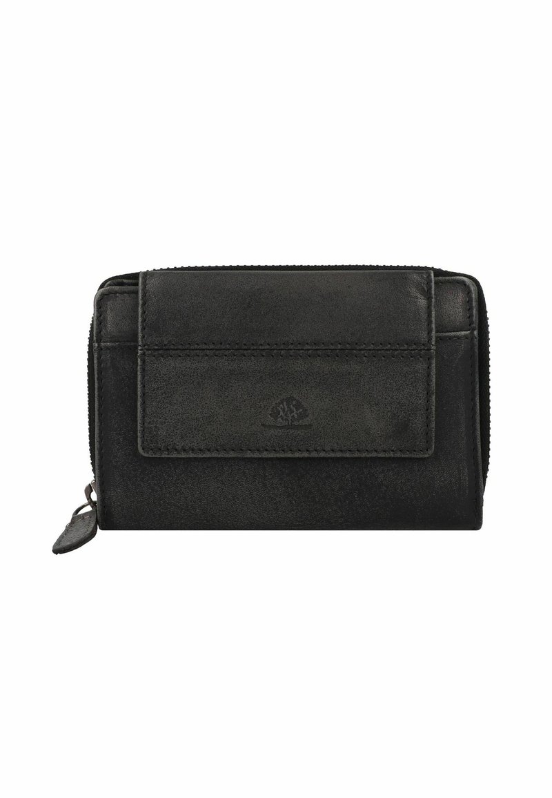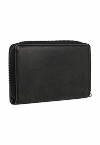Portafoglio in pelle nera con finitura testurizzata, chiusura con zip e tasca con pattina frontale. Presenta una sobria stampa a caldo del logo e cuciture a contrasto.