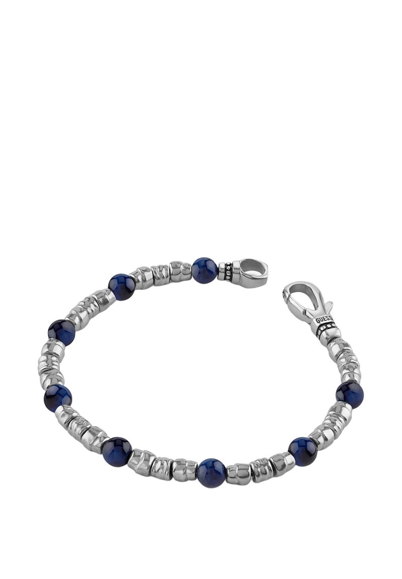 Bracciale con perline d'argento con perle tonde irregolari alternate in argento e blu navy, dotato di chiusura a moschettone incisa con "GUESS".