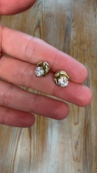 Orecchini a mezzaluna d'oro con cristalli rotondi trasparenti e piccoli dettagli a forma di stella su uno sfondo bianco.
