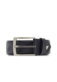 Cintura arrotolata in pelle nera con motivo intrecciato beige e nero, fibbia rettangolare argento e borchia triangolare argentata sulla punta.