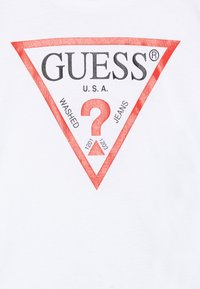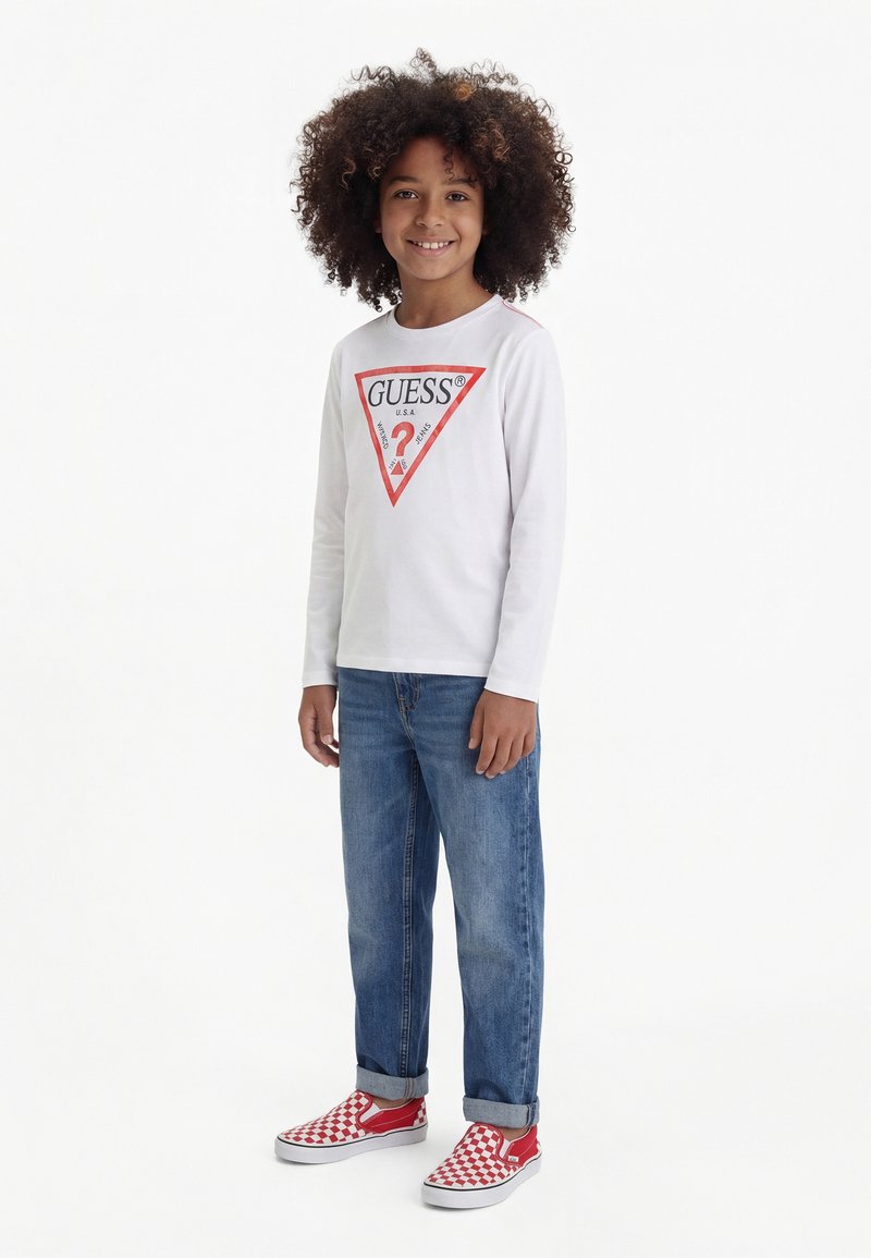 Bambino con capelli ricci che indossa una maglietta bianca a maniche lunghe GUESS, jeans blu e scarpe slip-on a quadretti rosse e bianche, sorridente verso la fotocamera.
