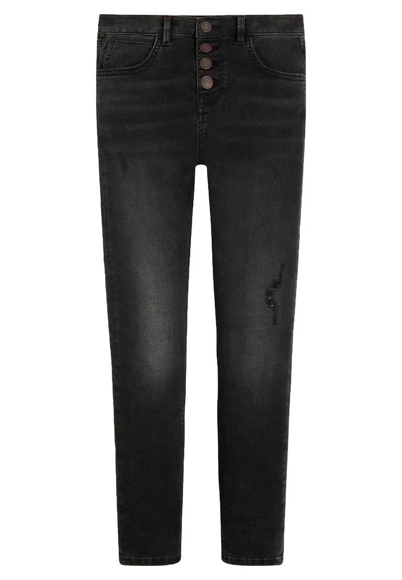 Jeans skinny neri con chiusura a bottoni, lievi usure sulle cosce, tasche anteriori e posteriori, e effetti di lavaggio sbiaditi.