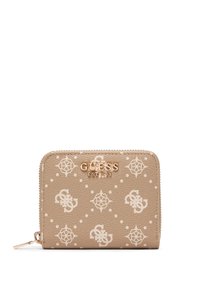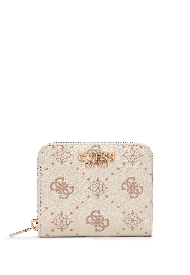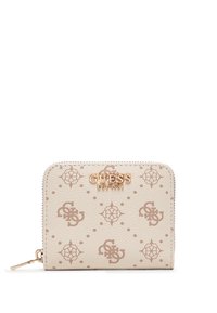 Portafoglio Guess beige con chiusura a cerniera, logo dorato, motivo monogramma e piccoli simboli decorativi, posato su sfondo bianco.