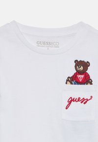 Ragazzo sorridente, indossa una felpa bianca con un orsetto e il logo "guess" sulla tasca del petto, jeans blu e sneakers bianche su sfondo bianco.