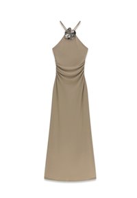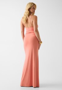 Donna con lunghi capelli biondi che indossa un abito senza maniche color corallo rosa con una decorazione floreale sulla scollatura, in piedi davanti a uno sfondo semplice.