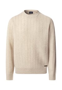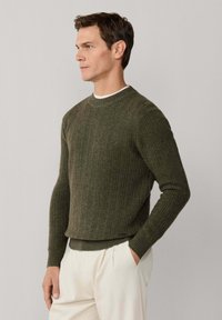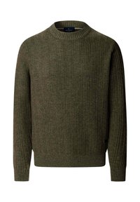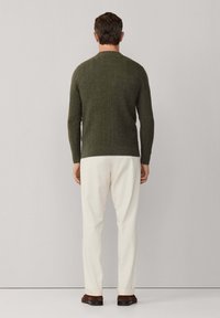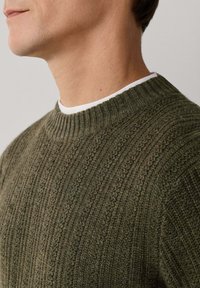 Maglione in maglia coste verde oliva con scollo rotondo, vita aderente e maniche lunghe; indossato sopra una camicia bianca e abbinato a pantaloni di colore chiaro.