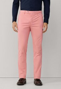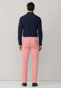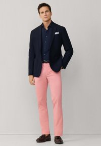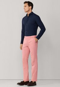 Uomo che indossa pantaloni rosa slim-fit, camicia blu scuro con bottoni e mocassini scuri con nappine, in piedi davanti a uno sfondo semplice.