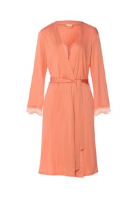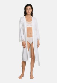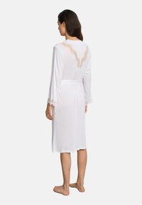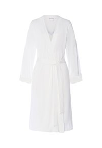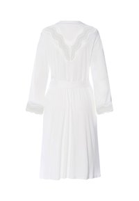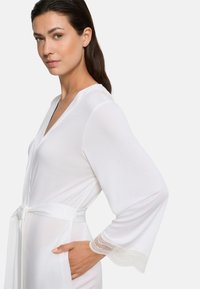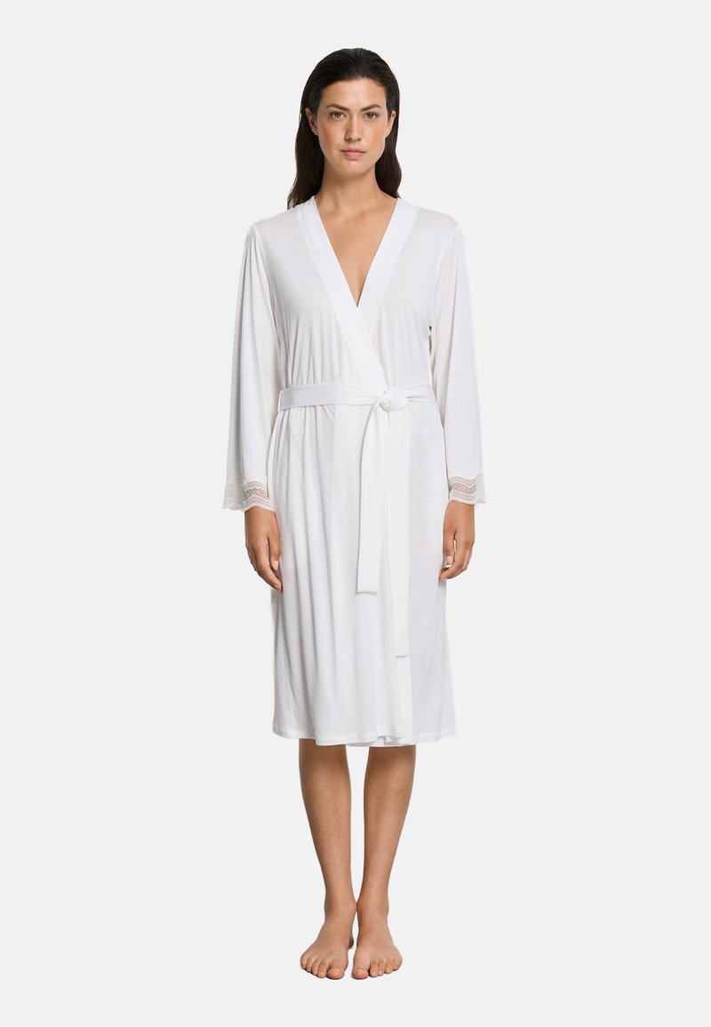 Donna in piedi a piedi nudi che indossa un accappatoio bianco fino al ginocchio con maniche bordate di pizzo e cintura annodata in vita, su uno sfondo neutro.