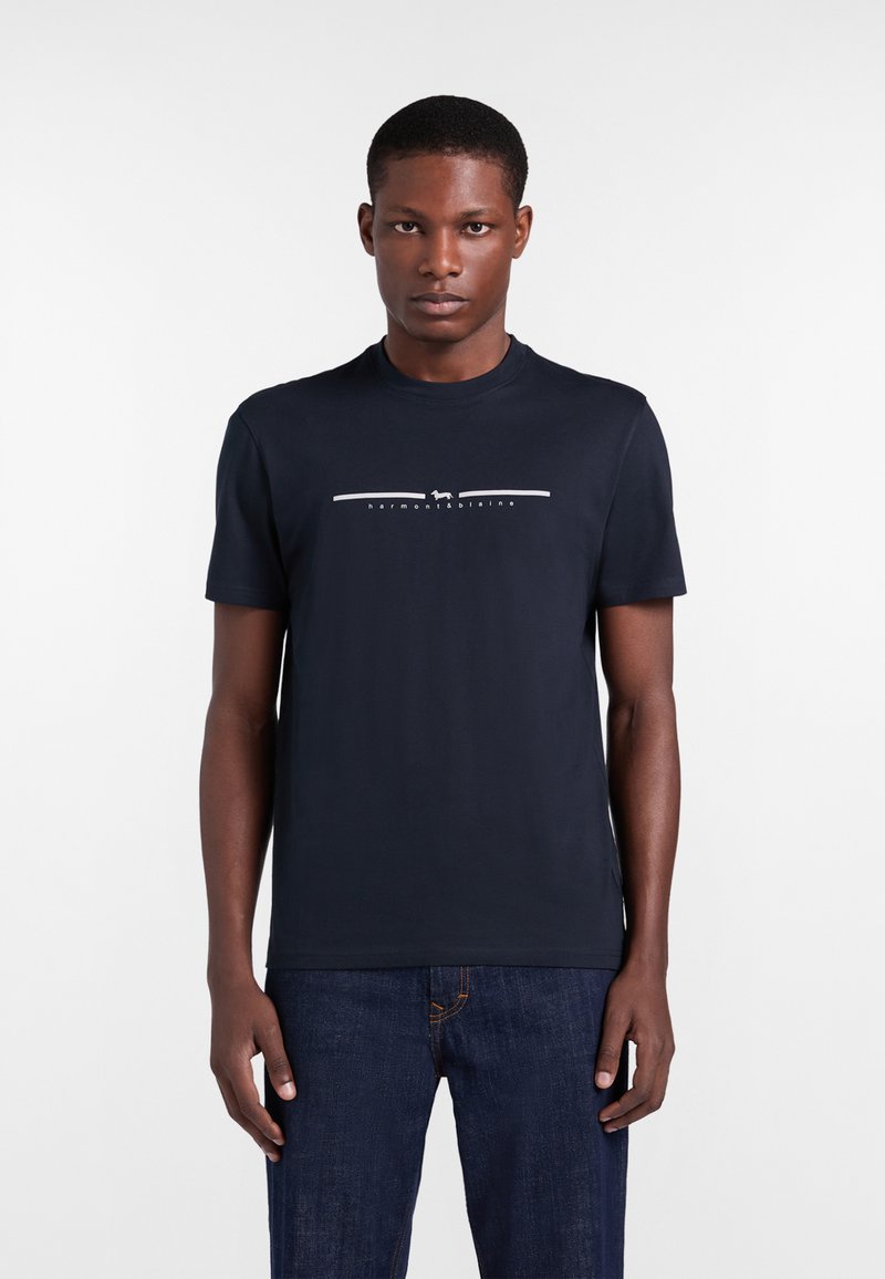 Uomo che indossa una maglietta blu navy con una piccola grafica bianca e la scritta "harmont & blaine" sul petto, abbinata a jeans blu scuro.