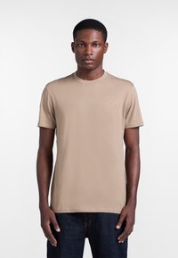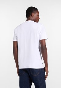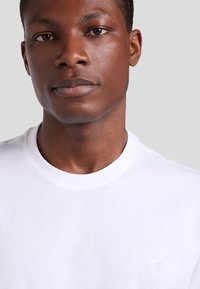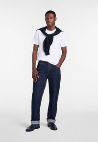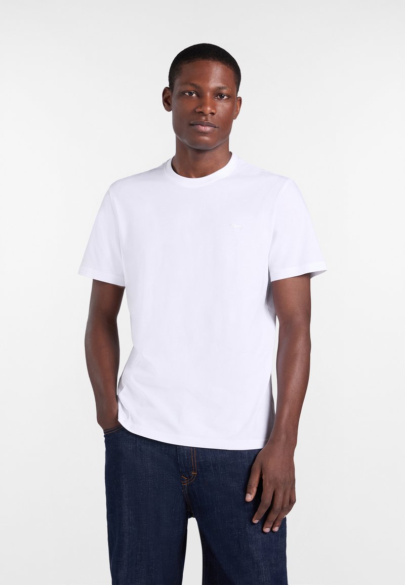 Giovane uomo in piedi che indossa una maglietta bianca a maniche corte e jeans blu scuro su uno sfondo bianco.