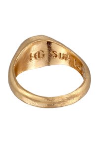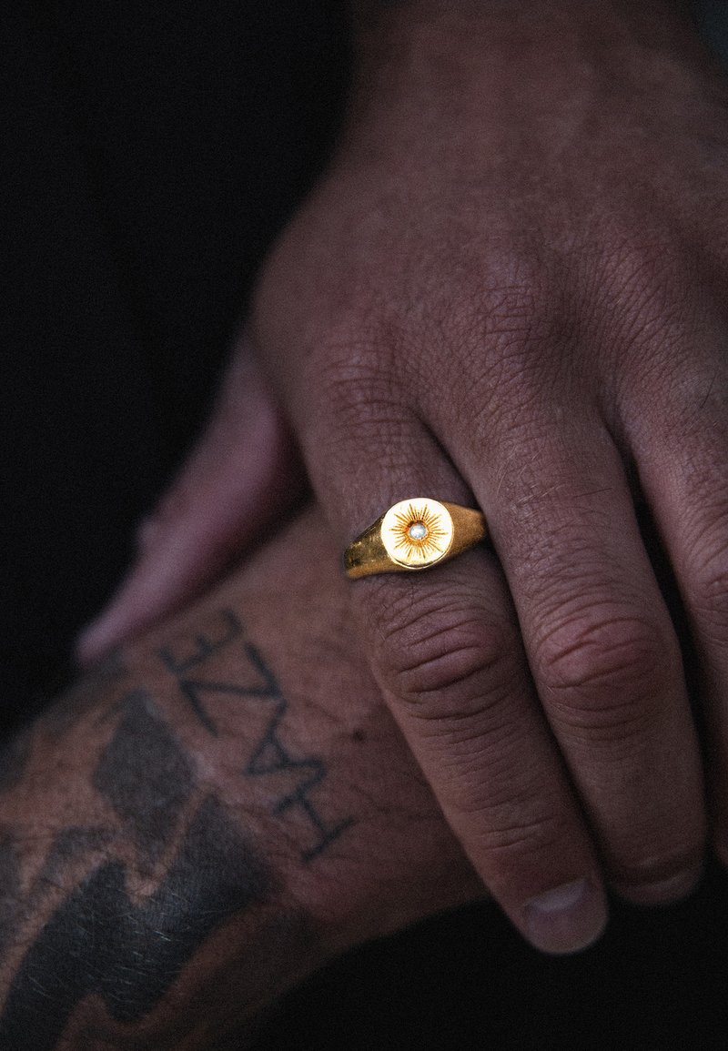 Questo splendente anello con sigillo "Sun Lover" in argento sterling 925 massiccio placcato oro, porta il sole come compagno quotidiano al dito. Dettagliato e martellato a mano, la parte superiore dell'anello raffigura il sole con una sfera di ottone dorato al centro. L'iscrizione manoscritta "Sun Lovers" è incisa in stile rustico. Questo gioiello fortemente ossidato si distingue per una perfetta finitura vintage. Nell'antica simbologia di diverse culture, il sole rappresenta la fonte di tutta la vita. Questo simbolo di forza vitale e volontà di vivere può essere un compagno quotidiano.
