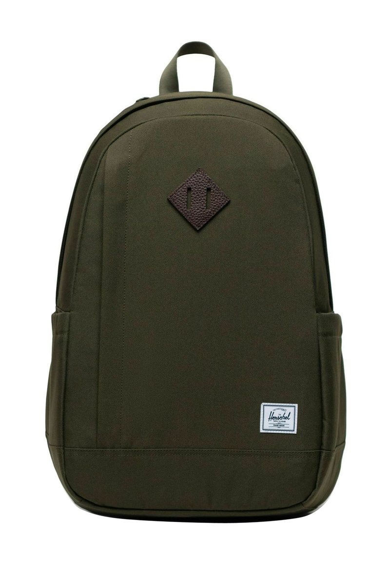 Zaino verde scuro con maniglia superiore, tasche laterali, toppa di pelle a forma di diamante e etichetta rettangolare bianca del marchio Herschel sul davanti.