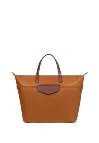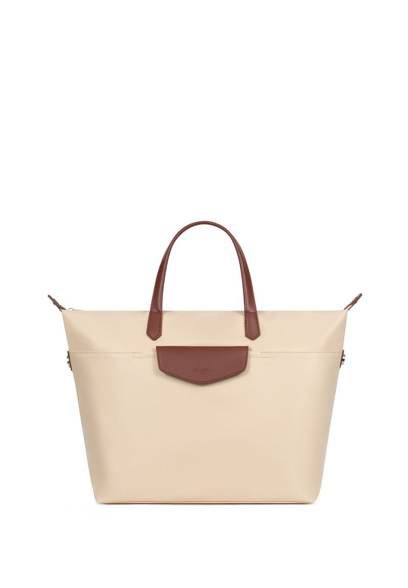 Borsa shopper beige con manici in pelle marrone e tasca frontale con patta, forma rettangolare, texture liscia e chiusura superiore con cerniera.