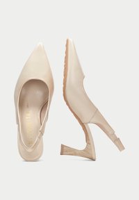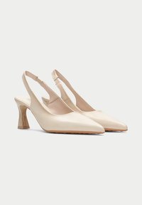 Scarpa slingback beige con punta a punta, tacco blocco curvo in legno di altezza media e tomaia in pelle liscia.