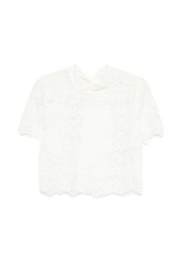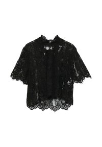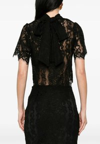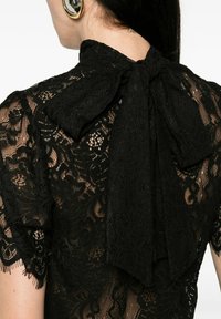 Donna che indossa un abito in pizzo nero trasparente con maniche corte e un grande fiocco legato dietro il collo, vista da dietro.
