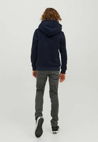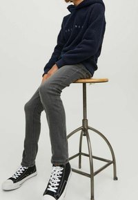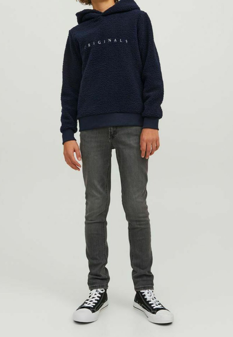 Felpa con cappuccio blu marina con scritta 'ORIGINALS', abbinata a jeans grigi slim fit e sneakers nere e bianche. Tessuto morbido e vestibilità rilassata.